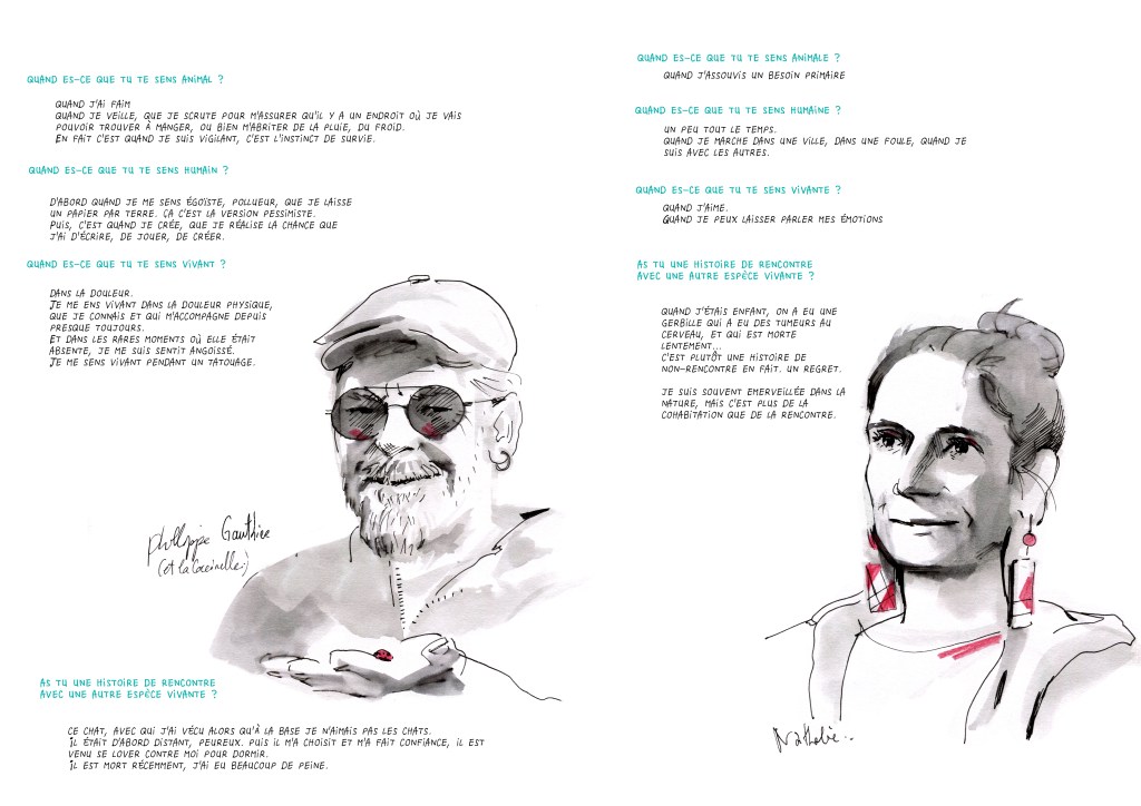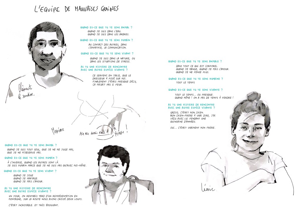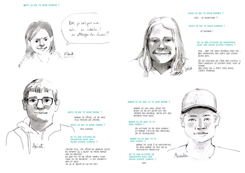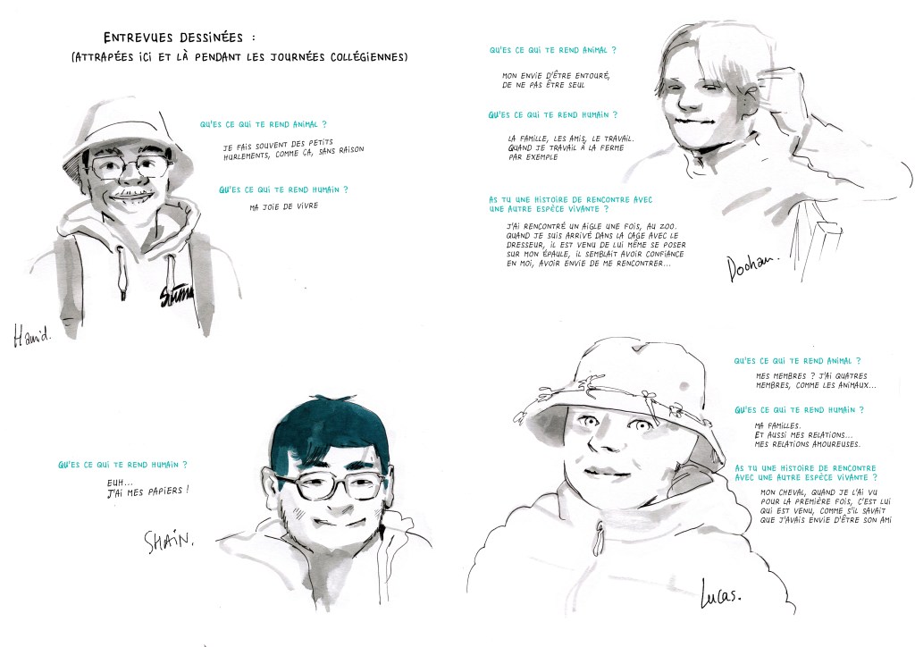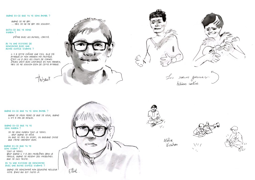 Présence, conversations et reportage dessinée autour de la pièce, lors d’ateliers avec des collégiens ou de déambulations.