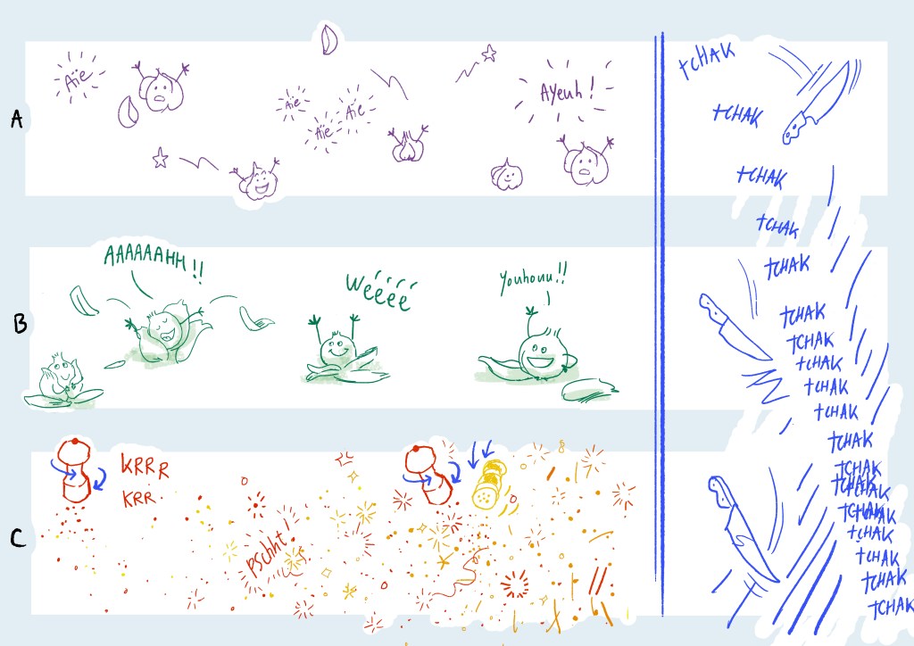 Anne Courel m’a demandé de mettre en image cette partition des ingrédients et des bruits de la recette chantée du Dahl de lentilles.